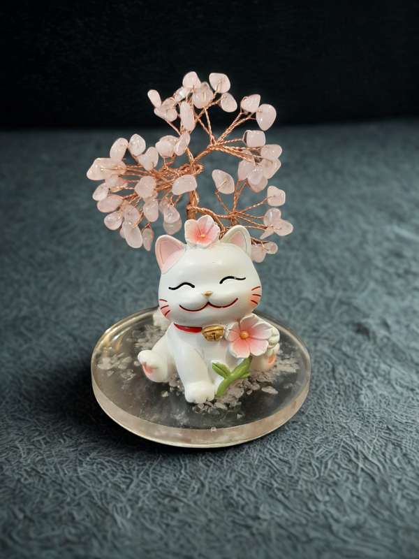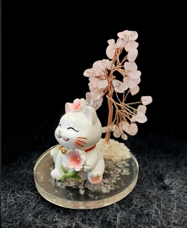 Arbre en Quartz Rose avec Chat porte-bonheur
